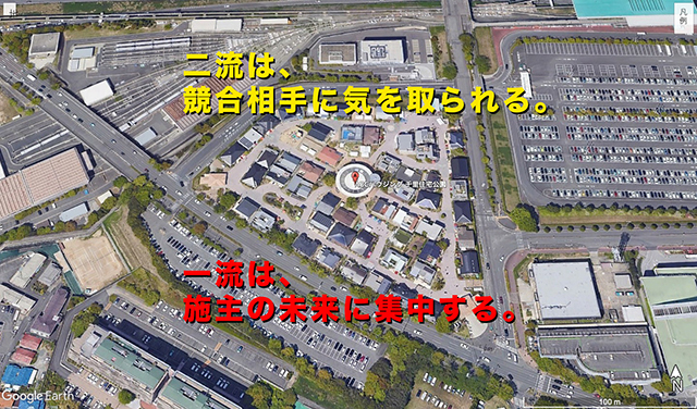 住宅展示場のモデルハウスは住まいではなく、住まいの皮をかぶった集客店舗であって、それはそれで用途・目的に対しての合理性はあります。しかし、お客様の欲しい、家族で住むための住まいとはいささか違ったものである事は疑う余地のないところです。今よりはずっと景況感は良かったのですが、当時の営業マンはそんな環境で多くのライバルと競合、いかに競り勝つかということに日々向き合っていたのです。