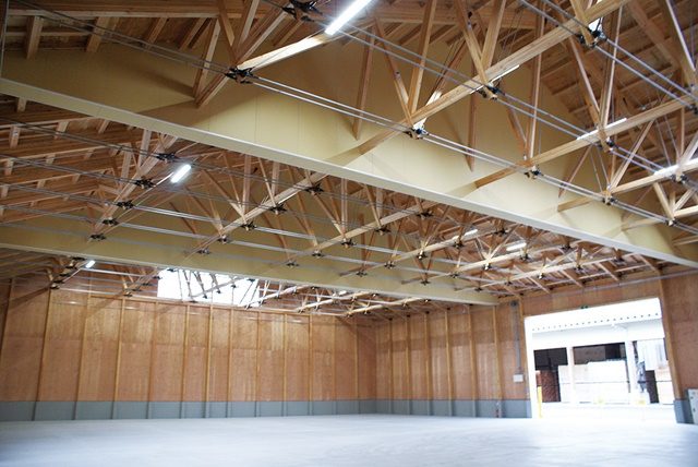 ヤマシタ工務店が「ATAハイブリッド構法」を採用して新築した長良川木材事業協同組合の製品保管庫(設計:荒井建築設計事務所施工:ヤマシタ工務店)。全長24mの大型トラスで大空間を実現