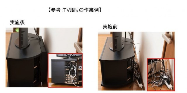 基本メニューでは、テレビ・パソコン・情報通信機器など5台までの機器まわりにある配線類の整理・配置が税込1万1550円。作業前後の写真などを添付した完成報告書が付く。