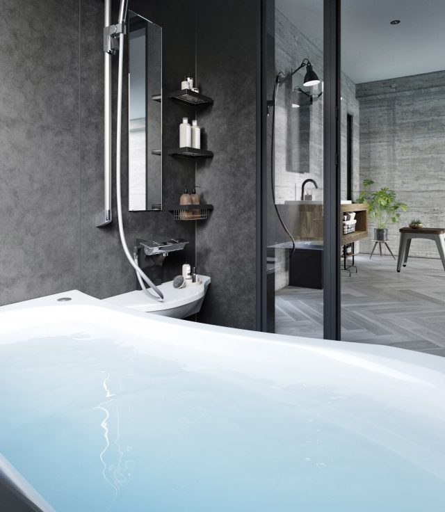 近年人気のインテリアスタイルのなかから、ダーク基調で素材感を重視した「ラスティック」、白基調に黒小物をアクセントできかせた「エリソンナチュラル」に注目。これら2つのスタイルに合う壁柄と水栓・ドア・収納棚といったブラックアイテムをバスルームに追加する。