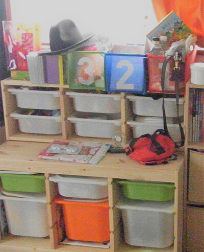 棚やかごへ入れる物は、ブロック、リカちゃんセット、変身セット、知育玩具、絵本などグループ分けをしてください。