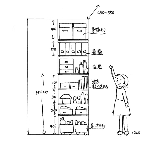 子ども専用コーナーは、お子さんの手の届く高さまでしか使いませんので、可動棚にして、置く物に合わせて棚板の高さを調整してください。