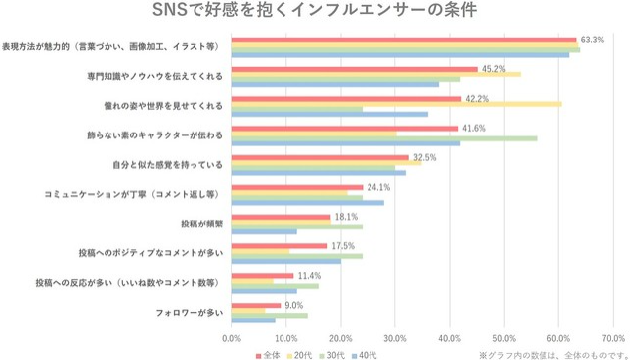 『SNSで好感を抱くインフルエンサーの条件』を聞いたところ、最も多かった回答は「表現方法が魅力的(言葉づかい、画像加工、イラストなど)」(63.3%)で、「専門知識やノウハウを伝えてくれる」(45.2%)、「憧れの姿や世界を見せてくれる」(42.2%)、「飾らない素のキャラクターが伝わる」(41.6%)、「自分と似た感覚を持っている」(32.5%)と続いた。