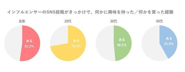 『インフルエンサーのSNS投稿がきっかけで、何かに興味を持った/何かを買った経験』の有無については、52.2%が「ある」と回答。20代では「ある」が7割以上と、「インフルエンサー消費」が当たり前になっていることが伺える結果となった。