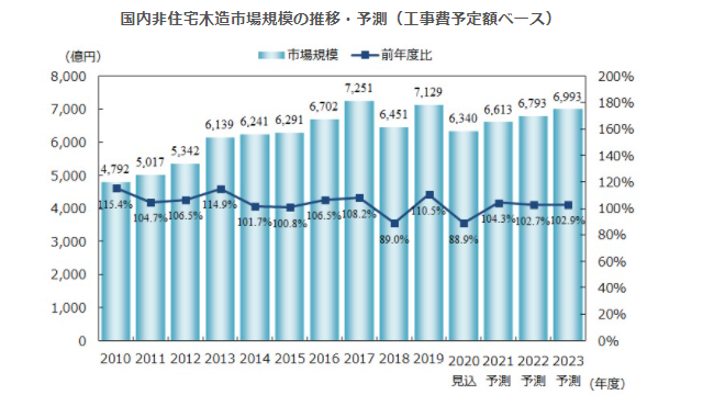 矢野経済研究所(東京都中野区)によると、2019年度の国内の非住宅木造市場規模は、床面積ベースで428万4000m2(前年度比103.0%)、工事費予定額ベースで7129億円(同110.5%)だった。工事費予定額ベースでは2010年度以降、2017年度に次いで2番目に大きい市場規模となった。この背景には、耐火木質部材を活用した大型物件の増加や労務費の高騰による工事単価の上昇があるとみている。新型コロナウイルス感染拡大の影響は、2019年度末(2020年2月以降)に計画していた一部案件に計画の中断・見送りや着工の延期などはあったが、市場全体への影響は軽微であったとする。