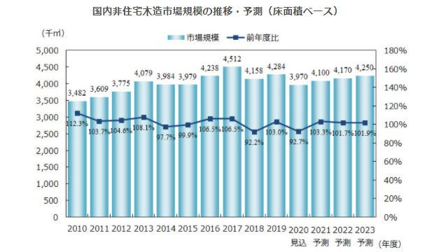 2020年度の国内非住宅木造市場規模は、床面積ベースで397万m2(前年度比92.7%)、工事費予定額ベースで6340億円(同88.9%)の見込み。
