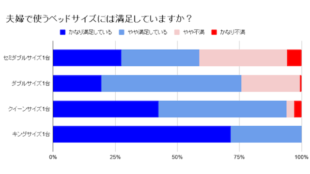 『使用しているベッドのサイズに満足しているか』聞いたところ、「セミダブルサイズ」を使っている人では4割以上が「不満」と回答。「ダブルサイズ」でも約25%が不満を感じていることがわかった。一方、「クイーンサイズ」、「キングサイズ」「ツインベッド(シングルサイズ2台)」の人では、広さに対する不満はあまり見られなかった。