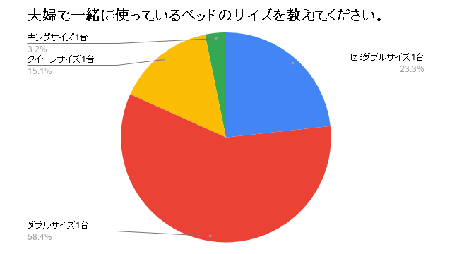 ダブルベッドを使用していると回答した人に対し『使用しているベッドのサイズ』を聞いたところ、「ダブルサイズ」(58.4%)が最も多かった。次いで「セミダブルサイズ」(23.3%)、「クイーンサイズ」(15.1%)、「キングサイズ」(3.2%)となった。