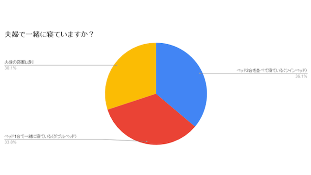 『夫婦で一緒に寝ているか』質問したところ、「ツインベッド(ベッド2台を並べて寝ている)」が36.1%、「ダブルベッド(ベッド1台で一緒に寝ている)」が33.8%、「寝室は別」が30.1 %となった。