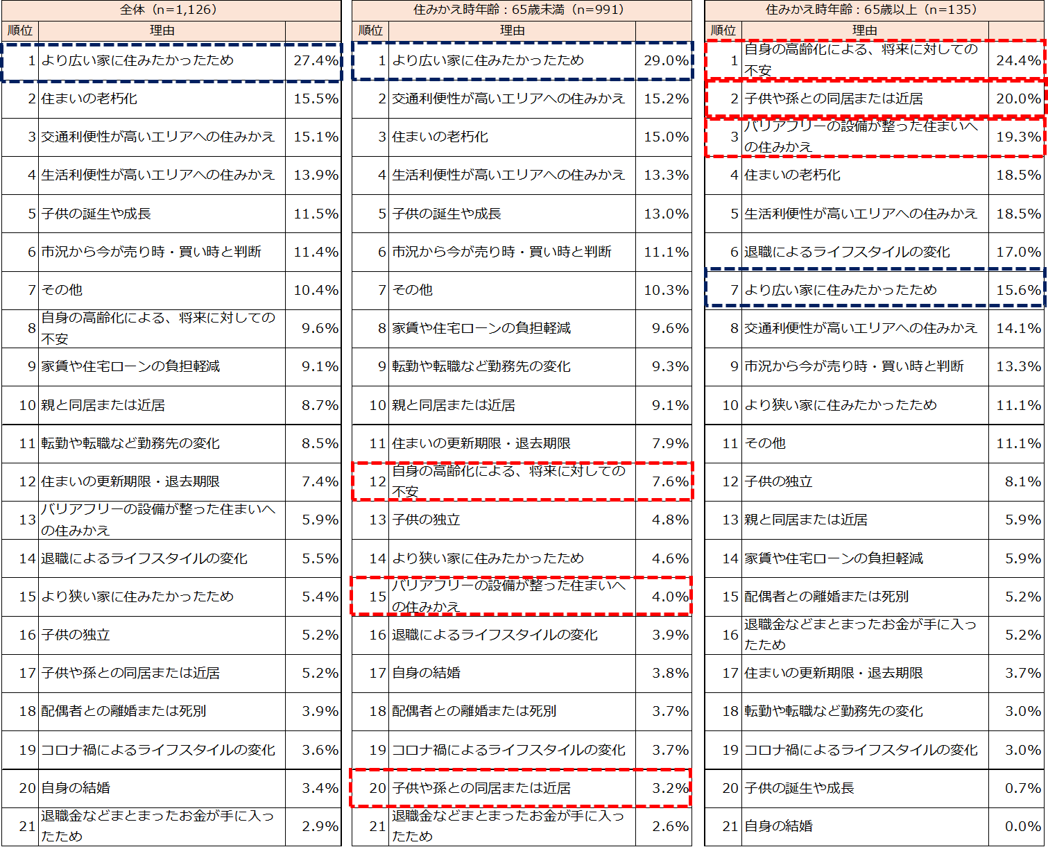 住み替え理由を聞いたところ、全体では「より広い家に住みたかったため」(27.4%)との回答が最も多く、「住まいの老朽化」(15.5%)、「交通利便性が高いエリアへの住み替え」(15.1%)と続いた。住み替え時の年齢別に見ると、65歳未満の人の理由は全体と大きく変わらない一方、65歳以上の人では「自身の高齢化による、将来に対しての不安」(24.4%)が最も多く、次いで「子供や孫との同居または近居」(20.0%)、「バリアフリーの設備が整った住まいへの住み替え」(19.3%)と、自身のシニアライフをより意識した回答が上位となった。