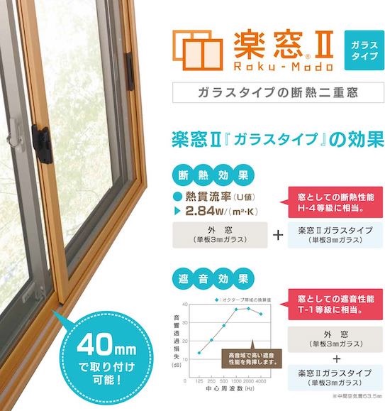 「楽窓Ⅱ」は、見付け寸法40mmの断熱内窓で、外窓(3mm単板ガラス)と組み合わせることで、U値2.84の断熱性能が得られるというもの。今回、「型ガラス4mm」3種類、「透明ガラス3mm」3種類の計6製品がグリーン住宅ポイントの対象商品となった。