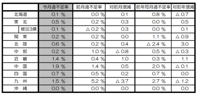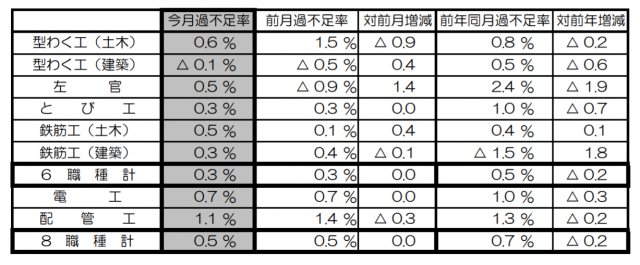 職種別の状況では、型わく工(建築)で過剰、その他の職種で不足となっており、特に配管工で1.1%と不足率が大きかった。また、左官の過不足率について、対前年の減少幅が2.4%から0.5%と大きくなっている。