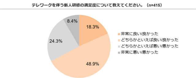 企業のマネジメント支援サービス「Co:TEAM」を運営するO:(オー、東京都目黒区)は3月25日、新卒1年目の就業者415人を対象に実施した「テレワーク下の新卒オンボーディング・新人研修の概況調査(2020年度版)」を公表した。新入社員に、テレワークを伴う新人研修の満足度を聞いたところ、「非常に良い/良かった」18.3%、「どちらかといえば良い/良かった」48.9%となり、約7割の新入社員が肯定的にとらえていることがわかった。
