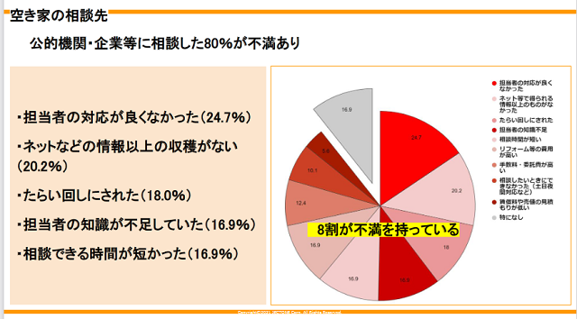 ジェクトワン(東京都渋谷区)はこのほど、空き家の総戸数が国内で最も多い東京都で空き家を所有しているオーナー302人を対象に実施した「2021年 東京都空き家所有者に対する意識調査」の結果を発表した。公的機関・企業などへ空き家活用の相談をした人のうち、約80%が不満を持っていることがわかった。「担当者の対応が良くなかった(24.7%)」「ネットなどの情報以上の収穫がない(20.2%)」「たらい回しにされた(18.0%)」「担当者の知識不足(16.9%)」「相談時間が短い(16.9%)」など、情報不足や体制に不満を持つ人が多かった。相談先の対応力の向上や改善が求められる。