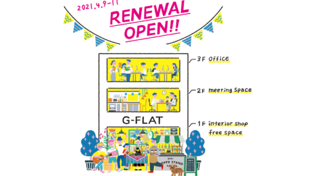 現在の場所から徒歩1分ほどの場所にあるビル一棟に丸ごと移転。ビル内は、1階が照明や観葉植物・家づくりのパーツなどを販売する「ジーフラットインテリアショップ」、2階がリノベーションを体感できるショールーム兼打ち合わせスペース、3階が同社事務所となっている。リニューアル後も現在に引き続き、テーマ別ショップイベントやワークショップ、家づくりの勉強会などを定期的に開催していくという。