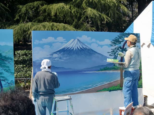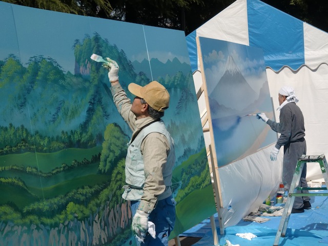 パフォーマンスは、現在日本にふたりしかいないとされる銭湯背景画のペンキ絵師である丸山清人さんと中島盛夫さんが富士山と福島県飯館村の風景を描くというもの。