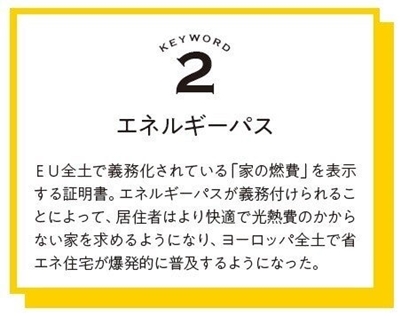 また、EUではすでに「エネルギーパス」が義務化されています。エネルギーパスとは、いわば「建物の燃費」を表示する証明書で、どのような建物でも、エネルギー消費量が一目で比較できる制度です。自動車の燃費と同じように、住宅の光熱費が分かります。