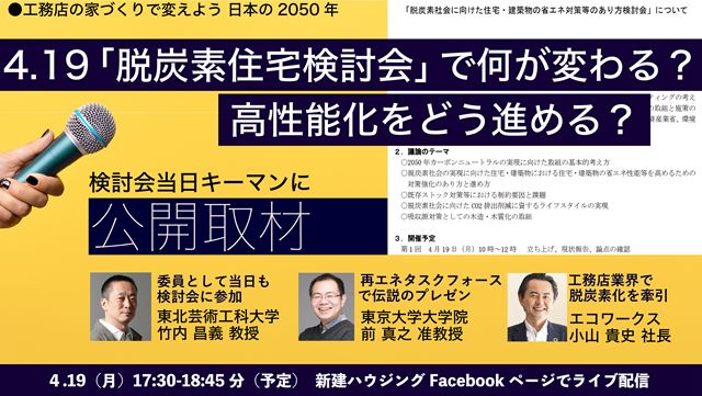 国土交通省、経済産業省、環境省の3省により4月19日10時からYouTubeで中継される「脱炭素社会に向けた住宅・建築物の省エネ対策等のあり方検討会」。新建ハウジングではその検討会の内容を踏まえて、同日17時30分から、検討会に委員として参加している東北芸術工科大学の竹内昌義教授と、東京大学大学院の前真之准教授、そしてエコワークスの小山貴史社長の3者に公開取材を行う。その模様を新建ハウジングのFacebookページ上でライブ配信する。聞き手は新建ハウジング発行人の三浦祐成。