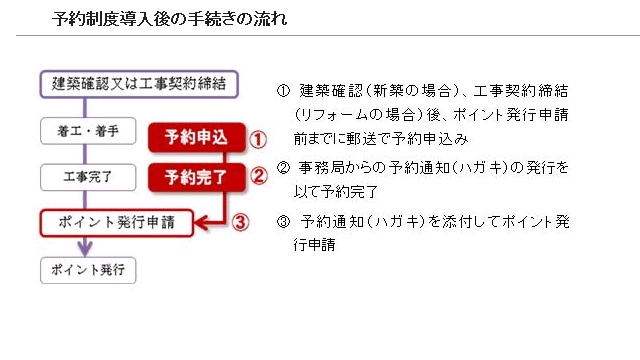 対象は、新築・リフォーム問わずすべての住宅。新築の場合は建築確認後、リフォームの場合は工事契約締結後に、郵送で予約する。事務局での予約が完了すると、予約通知(ハガキ)が送られてくる。ポイント発行申請には、この予約通知を添付する。