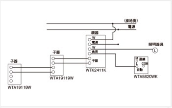 1台のスイッチで照明の点灯と連動して換気扇が、ONする機能。さらに、換気扇は照明消灯後、一定時間動作し、自動OFF。