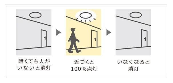 周囲の明るさを感じて、明るければ、人が近づいてもあかりは点灯しません。明るさセンサーが働く照度(明るさ)の調整も可能。