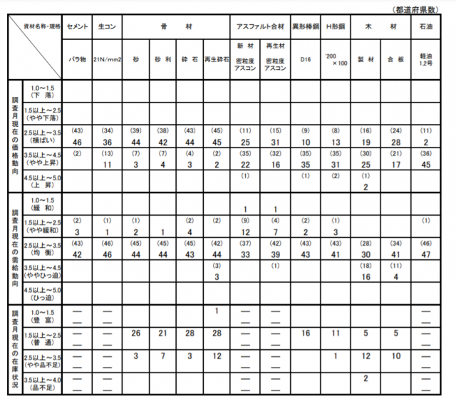 調査は、建設資材の供給側(生産者、商社、問屋、販売店、特約店)と需要側(建設業者)から約2000社のモニターを選定し、主要建設資材の需給、価格、在庫の変動状況を把握することを目的に実施している。
