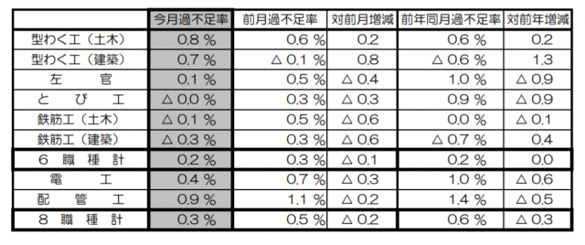 職種別の状況では、とび工、鉄筋工(土木)、鉄筋工(建築)で過剰、その他の職種で不足となっており、前月に続き配管工の不足率が最も大きく0.9%。また、型枠工(建築)の過不足率について、対前年の減少幅が1.3ポイント(0.6%過剰から0.7%不足)と大きくなっている。
