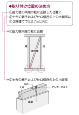 土台と基礎の緊結は令第42条に規定されています。しかし令第42条では「土台は、基礎に緊結しなければならない」とのみ規定されているだけで、具体的な緊結方法はありません。一般的に土台と基礎はアンカーボルトで緊結しますが、アンカーボルトの具体的な配置については住宅金融支援機構の「木造住宅工事仕様書」が参考となります。