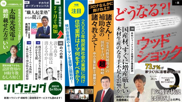 7面では、毎月10日号の人気連載「松尾和也のエコハウス設計メソッド」で、太陽光発電の買取単価と設置費用の関係性を解説してもらったほか、16面では、先月19日に初会合が開かれた「脱炭素社会に向けた住宅・建築物の省 エネ対策等のあり方検討会」終了後に、委員として会合に参加した竹内昌義・東北芸術工科大学教授のほか、前真之・東京大学大学院准教授、小山貴史・エコワークス社長の3人のキーマンに対し、オンラインで公開取材した模様を伝えています。【栁原潤】