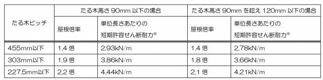 対応可能なたる木の高さ。120mm 以下のたる木で評価を取得。屋根倍率を利用する場合、120mmを超えるたる木は対応不可
