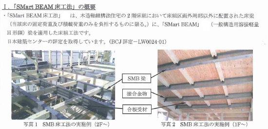 タツミと住友金属は、木造軸組工法住宅の2階床組みでの梁成低減やロングスパンを可能にするため軽量H形鋼梁を適用した床組工法「SMartBEAM床工法」を提案している。