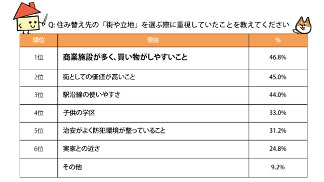 『住み替え先の街や立地を選ぶ際に重視したこと』を複数回答で聞いたところ、「商業施設が多く、買い物がしやすいこと」が46.8%と最も多かった。理由としては「家を探す前はもっと自然の多い所に住みたいと思っていたが、やはり結局は周りの便利さを選んでしまった」、「老後を考えて駅近の物件にした」などが挙げられた。
