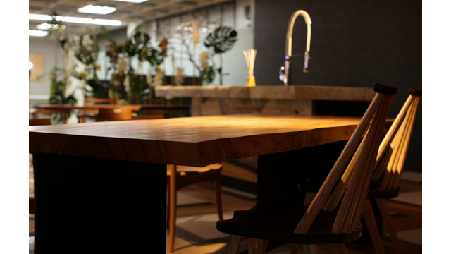 ショールームでは100樹種以上の無垢一枚板を常時在庫。コロナ禍での家での楽しみ方、オフィスや在宅ワークの在り方などを提案しているほか、サステナブルな店舗づくりに向けた提案なども随所に散りばめた内装建材や家具などを展示している。展示品そのものの注文ではなくオーダー注文にも柔軟に対応が可能。オリジナルのものづくりを叶えるアイディアの着想の場としても活用できるため、デザイナーや設計者の来場も見込んでいるという。