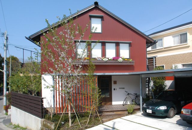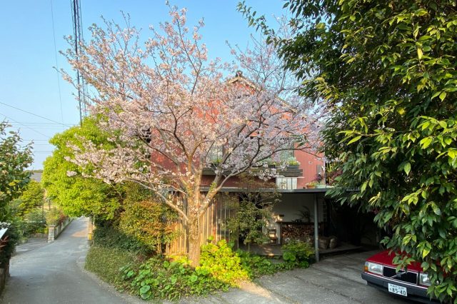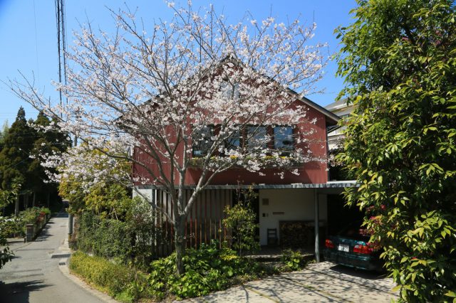 完成当時は桜の木がそんなに大きくなるイメージが持てていなくて、撮影の際に幹の広がりを入れるため立つ位置がどんどん下がっていって、年代を追うごとに家が小さく写っています。ビフォー&アフターや数年越しの定点撮影は、気が大きくなった将来形(未来予想図)をイメージして構図を決めておくものですね↓