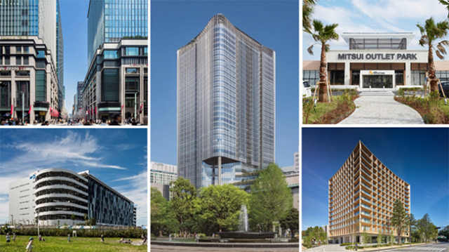 (左上)COREDO室町1・2・3、(左下)三井不動産ロジスティクスパーク船橋Ⅰ、(中央)東京ミッドタウン日比谷、(右上)三井アウトレットパーク 木更津、(右下)三井ガーデンホテル 神宮外苑の杜プレミア