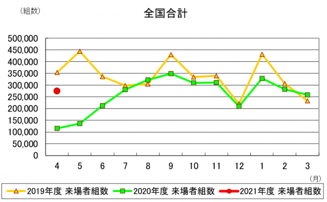 各エリアの来場者組数とその前年対比は以下の通り。カッコ( )内は対前年同月比の増減を表す。