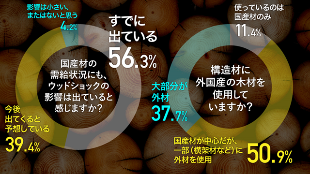 ウッドショックの発生を受け、新建ハウジングでは4月16日~ 28日、全国の工務店・住宅関連事業者を対象にアンケート調査を実施した。その結果、7割がウッドショックの影響を受けていると回答。さらに、国産材を中心に利用している工務店でも、半数以上がウッドショックの影響を感じており、国産材の需給にも問題が波及していることが見て取れる。・・・