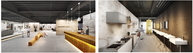受付のある7階にはキッチンや洗面などの水回り商品、8階にはタイルや建具、エクステリア商品を配置する予定。延床面積は7階203.23坪、8階161.67坪。