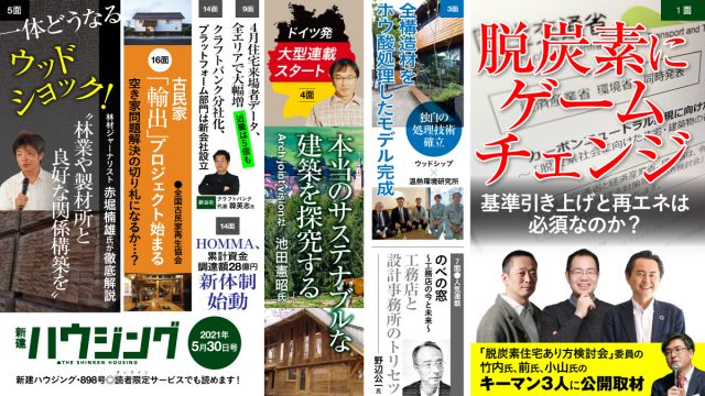 新建ハウジング5月30日号のトップ記事では、“2050年のカーボンニュートラル”の実現に向けて、国交省、経産省、環境省の3省により設置された「脱炭素社会に向けた住宅・建築物の省エネ対策等のあり方検討会」の第2・3回の議論の模様や両回の後に、出席委員らを招いてオンラインで行った公開取材の内容を掲載している。