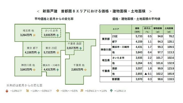 首都圏全体の平均価格は3970万円で、前月から0.3%上昇。エリア別では「千葉県他」が前月からわずかに下落したものの、「東京都下」、「横浜市・川崎市」、「さいたま市」、「千葉県西部」の4エリアで1%以上の上昇率となるなど全体的に上昇が目立つ。「東京23区」、「東京都下」、「さいたま市」、「埼玉県他」、「千葉県西部」の5エリアは2017年1月以降で最高額となった。