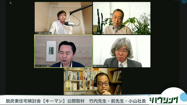 新建ハウジングでは、第1回に引き続き竹内昌義さん(東北芸術工科大学教授、同検討会委員)、前真之さん(東京大学大学院教授)、小山貴史さん(エコワークス社長)への公開取材を行い、4月22日に菅義偉総理が表明した「2030年の温暖化ガス削減目標46%」も踏まえ、改めて業界の課題や望ましい施策の案を議論した。