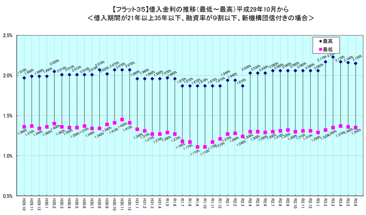住宅金融支援機構(東京都文京区)は6月1日、住宅ローン「フラット35」取扱金融機関が適用する6月の融資金利を発表した。返済期間21年以上35年以下の最低金利は、融資率9割以下が1.35%、9割超が1.61%と、いずれも2カ月連続で下降。最高金利は、9割以下が2.15%、9割超が2.41%で、前月から0.01ポイント下がった。