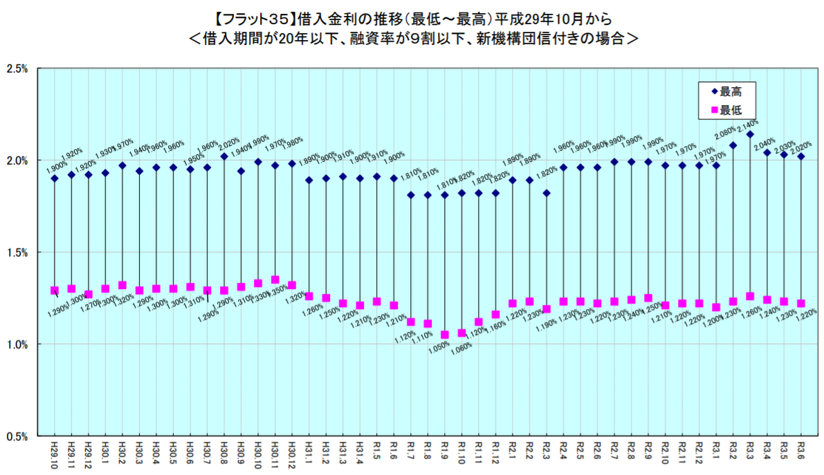返済期間20年以下の「フラット20」の最低金利は、融資率9割以下が1.22%、9割超が1.48%で、いずれも前月から0.01ポイント下がり、3カ月連続の下降となった。最高金利は、9割以下が2.02%、9割超が2.28%で同じく0.01ポイント下がった。