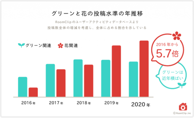 RoomClip住文化研究所は、 RoomClipに投稿された膨大な写真やコメント・タグなどの実例データと、検索や閲覧などの行動データ、ユーザーアンケート・インタビューなどを基に、住まい・暮らし領域のトレンドや消費性向などについて研究・発表している。3回目の今回は、「花とグリーン」を「飾る」と「育てる」の2つの要素に分け、取り入れ方の変遷と今のトレンドを調査。新型コロナが生活に大きな影響を与える中、RoomClipユーザーの投稿、行動変化をレポートした。