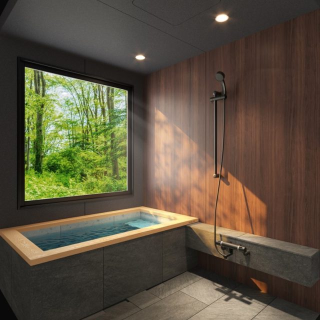 浴槽の框にヒノキを、内部に希少石の十和田石を標準採用し、マットブラック色のデザイン水栓、天然石の風合いを再現した高性能セラミックタイルを組み合わせた。十和田石は水に濡れると鮮やかな青色になり、癒しを演出するという。