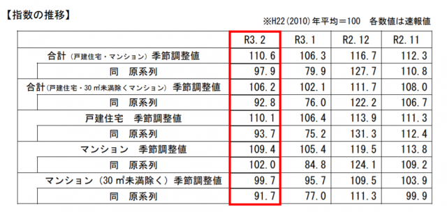 国土交通省は5月31日、登記データをもとに個人が購入した既存住宅の移転登記量を加工・指数化した2021年2月分の「既存住宅販売量指数」を公表した。戸建て・マンション合計・季節調整値は前月比4.0%増の110.6(前年同月比0.6%増)、床面積30m2未満を除いた合計・季節調整値は前月比4.0%増の106.2(前年同月比2.5%増)だった。そのうち、戸建住宅の季節調整値は前月比3.5%増の110.1となった。