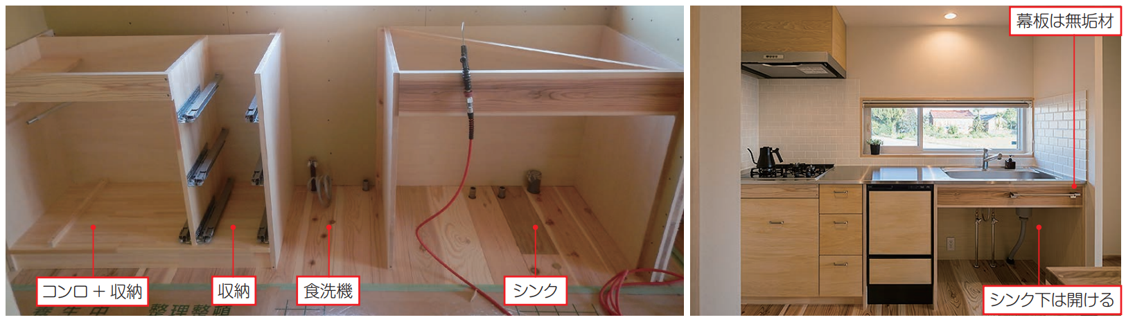 左/キッチンキャビネットの例。シナランバーコア21mmを中心に組んでいる。幕板はスギのムク材。背板はシナベニア4mm厚。右/ガスコンロ、食洗機、シンク、収納という基本機能を集約した流し台。シンク下部は漏水などが発見しやすいように開けておく