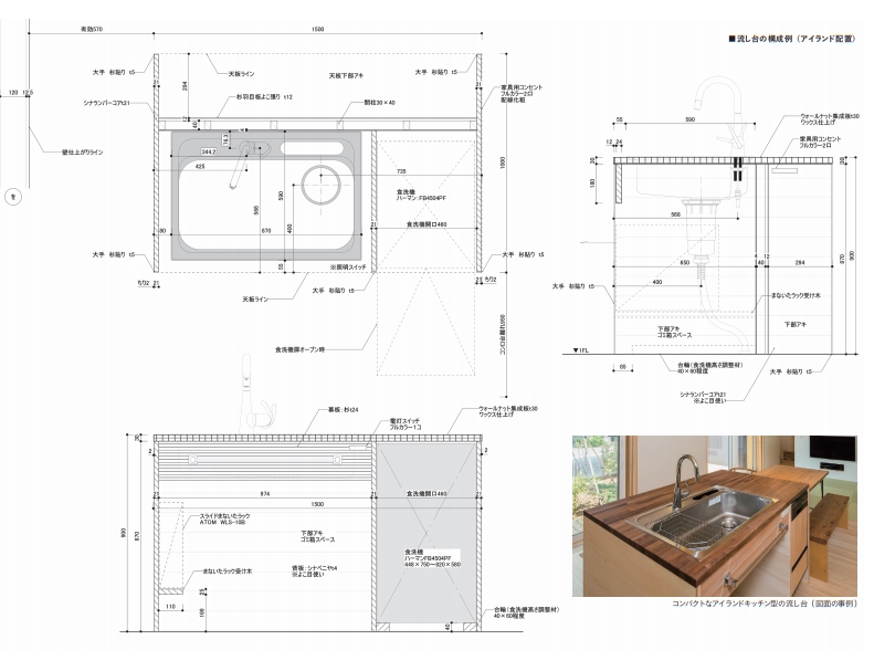 キッチンにおいては流し台と作業台兼食器棚を前後2列に配置するか2面の壁を使ってL字に配置することが多い。流し台の奥行きは650~700mm、作業台兼食器棚は450mm、吊戸棚は300mm程度だ。ビルトイン機器は食洗機とシンク、IHクッキングヒーター(IH)を組み込むのが基本だ。