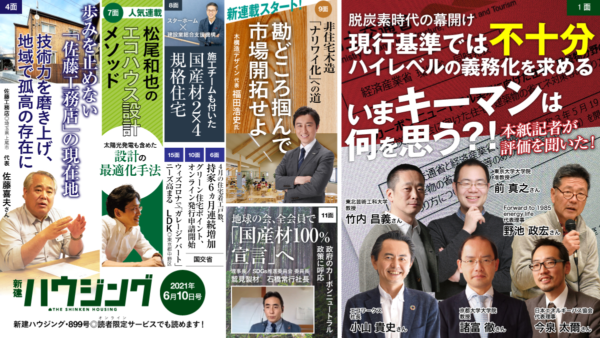 しかし、エネルギー問題の専門家や、住宅の高性能化に取り組んできた団体のリーダーたちからは、より高いレベルの基準を求める声があがっている。新建ハウジングではこのほど、あり方検討会の内容や、住宅の脱炭素化施策について、各所から意見を募った。6月10日号の1~2面で、その一部を紹介する。