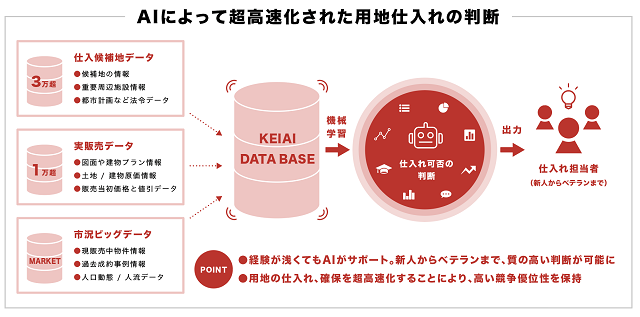 注文住宅事業、分譲住宅事業を展開する同社は、3万件以上の仕入候補地データと1万件以上の実販売データを独自に保有している。今回、これらの実績データと最新の市況感データを活用し、自社開発したAIに機械学習をさせることで、超高速の買付判断を可能にする仕入れ体制を構築するという。